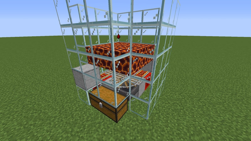 マグマブロックでも上の画像のように水流でアイテムを流すようにすると、レールやホッパー付きトロッコが必要なくなります。