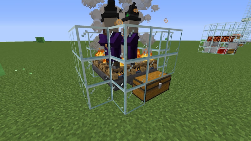 この窒息はダメージ量が非常に大きくて、ウィッチもあっという間です。実際にサバイバルモードにして自分で試してみると、体力が6くらいずつ減っていきました。ダメージ効率はかなり良いですが、トロッコを24個作る必要があるのと、多用するとワールドが重くなる可能性があるというデメリットもあります。個人的にはあまり好きではない方法です。