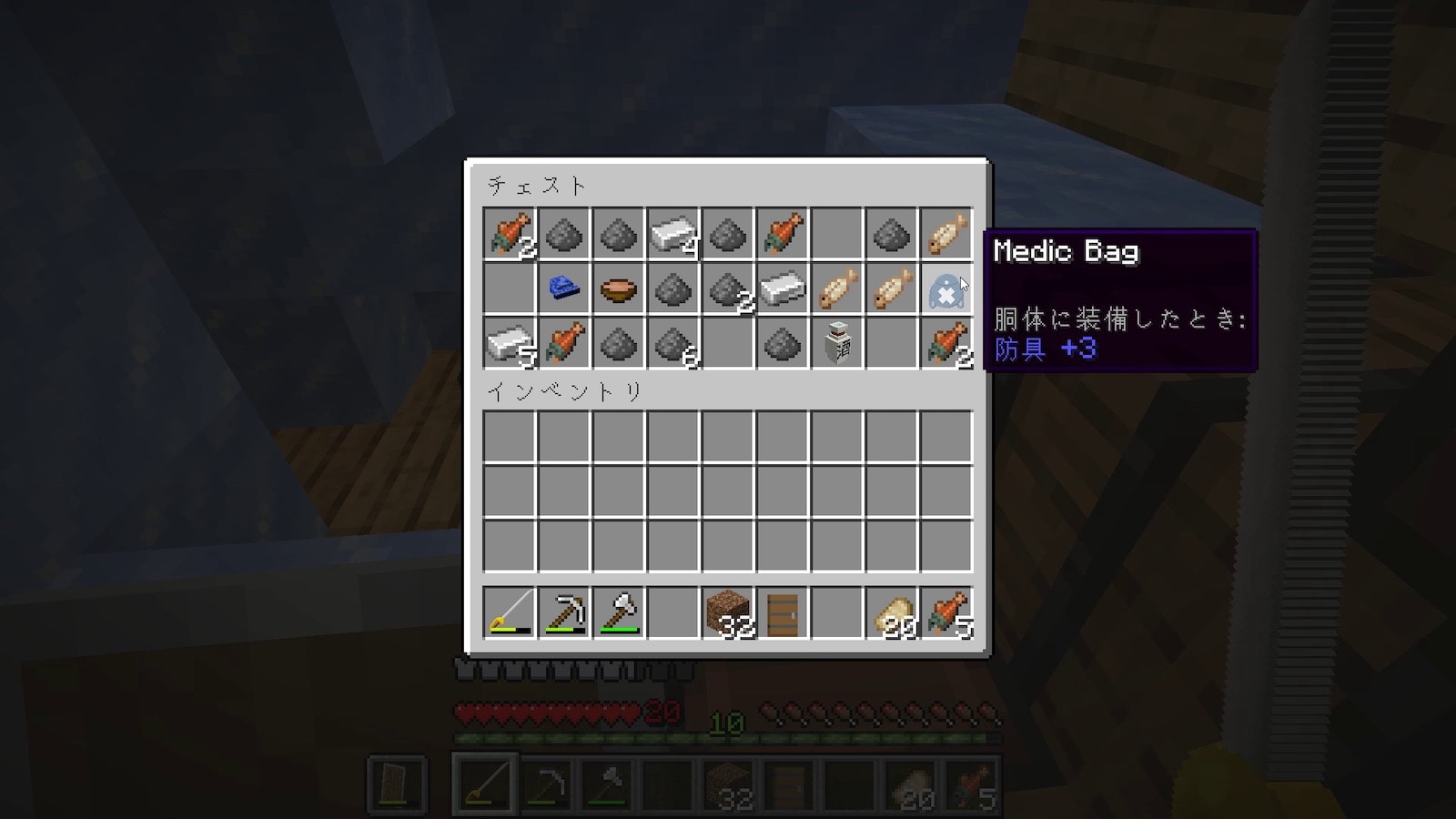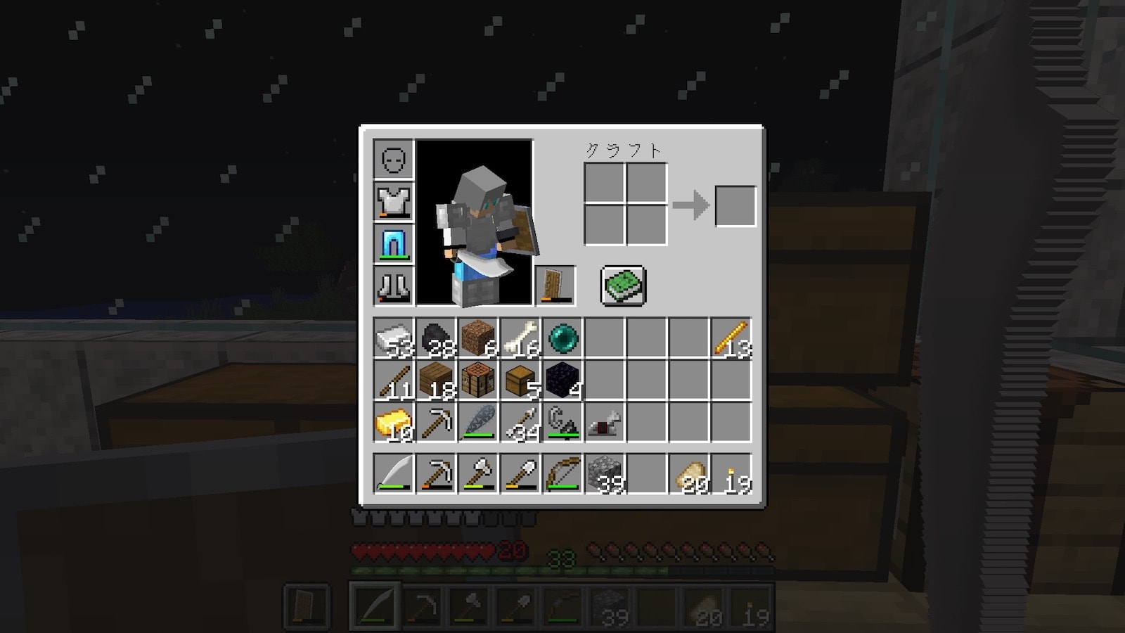 ただし、今の状態で遠出をするといろいろと不便なので、持てるアイテムを増やすためにエンダーチェストを作るのと、ダイヤ防具を一式そろえるためにブランチマイニングを実施しました。そのために連鎖破壊Modを導入しました。