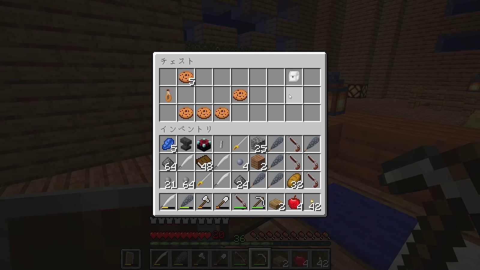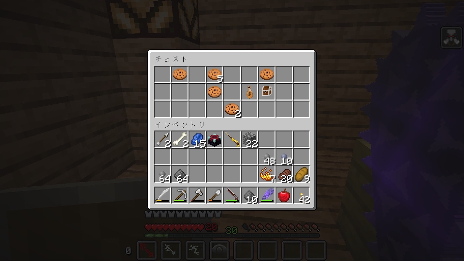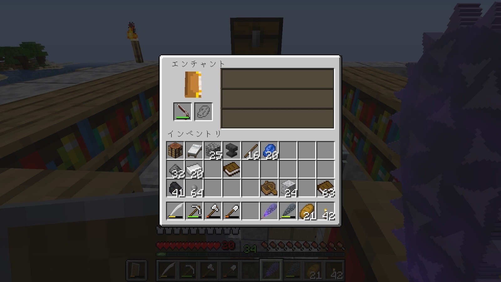 前回ネザーでブレイズロッドを手に入れたので、エンダーチェストを作りましたが、シルクタッチがないので結局使い物にならないことに気がつきました。シルクタッチをつけるのにエンチャントテーブルが必要で、エンチャントテーブルは作れますが本棚がないので、村を訪れることに。