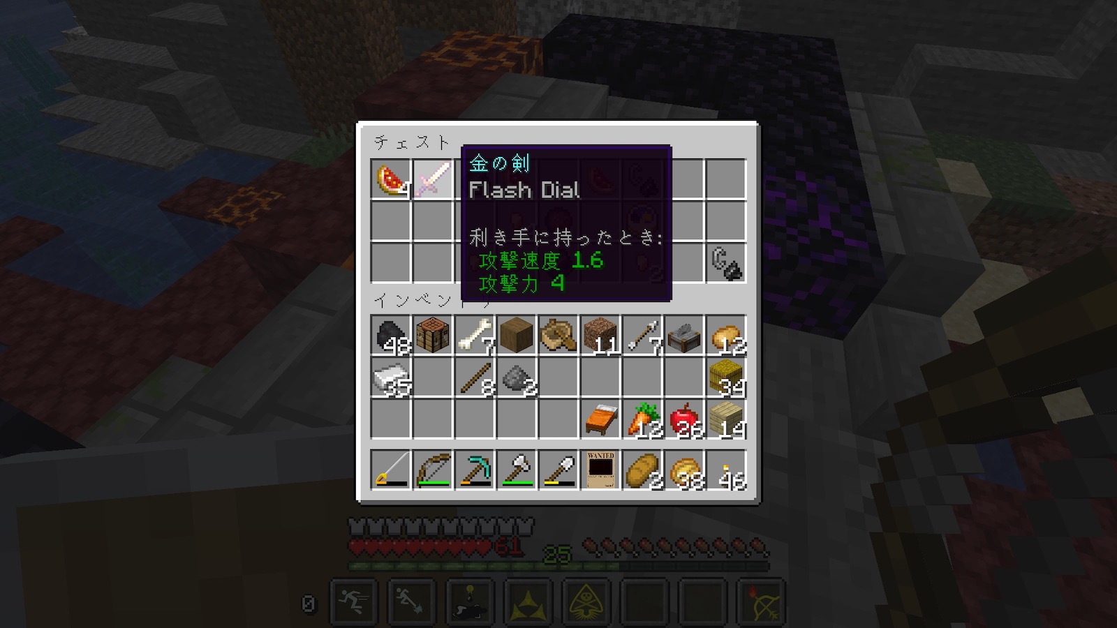 ネザーゲート跡地のチェストに、フラッシュダイアルのエンチャントがついた金の剣を発見しました。