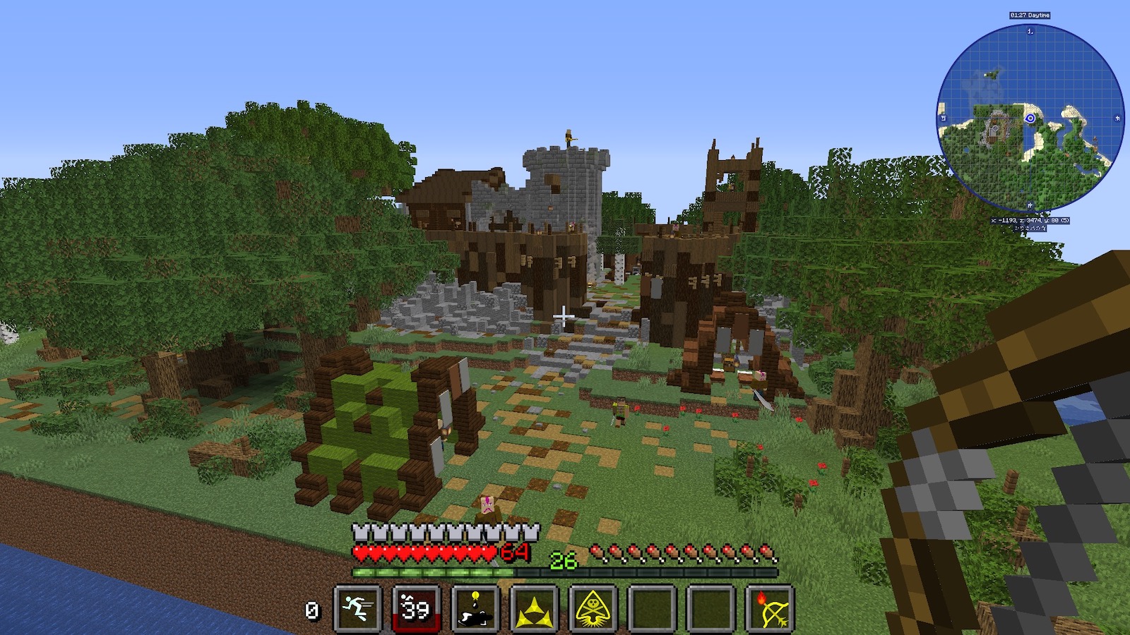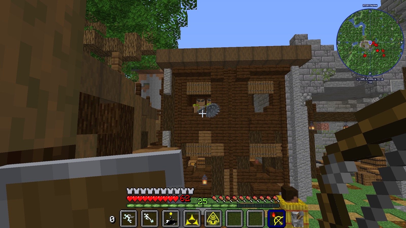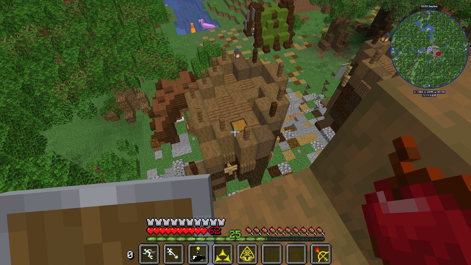 「OptiFine」の機能で拡大してみると、塔の上に見張りが見えました。こちらはスナイパーなので、遠くから排除しておきました。こういうときはスナイパー役立つなぁ。