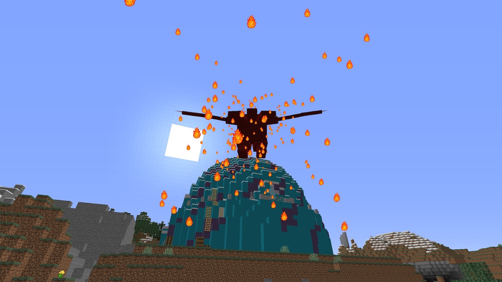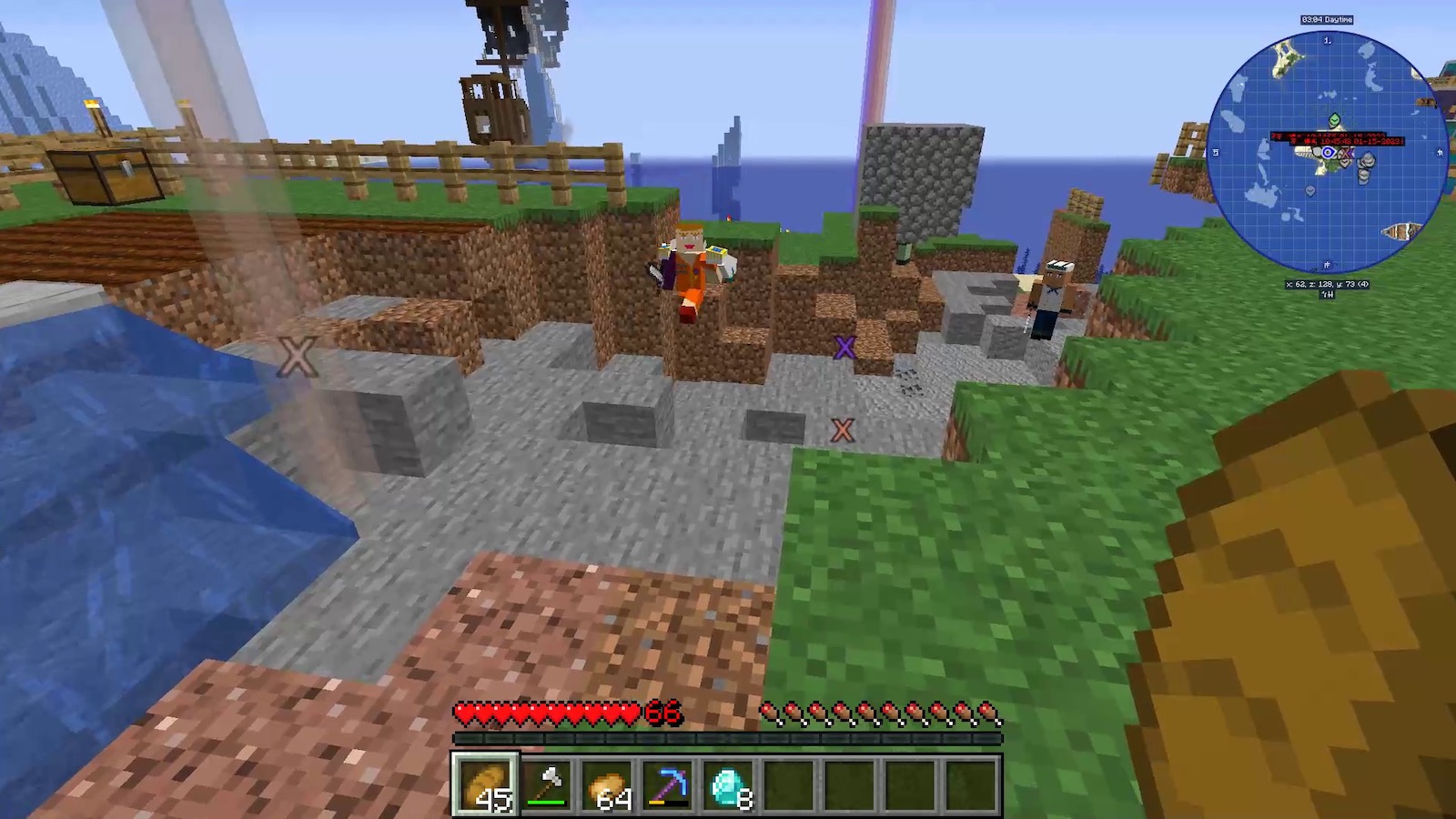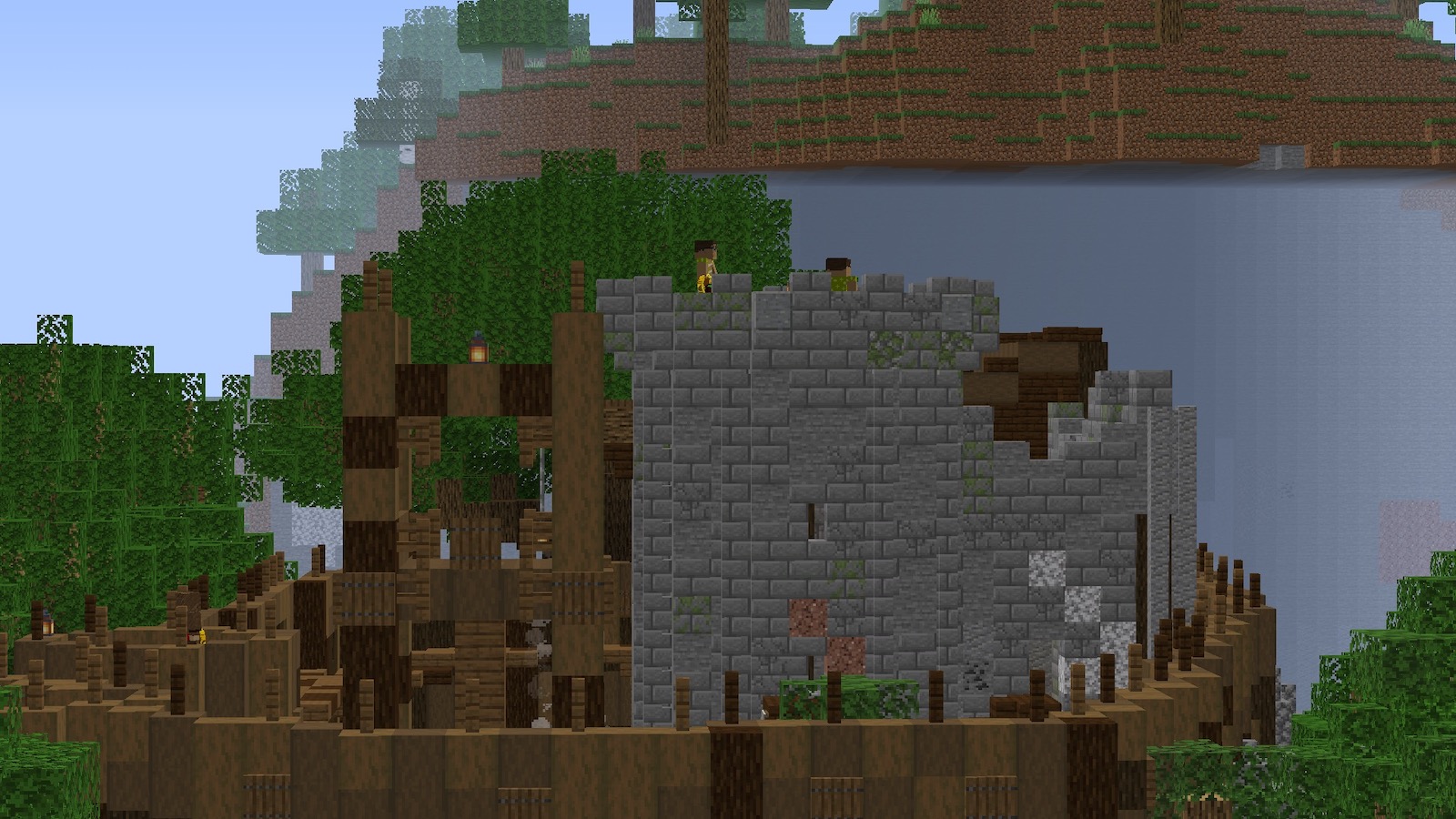 「OptiFine」の機能で拡大してみると、塔の上に見張りが見えました。こちらはスナイパーなので、遠くから排除しておきました。こういうときはスナイパー役立つなぁ。