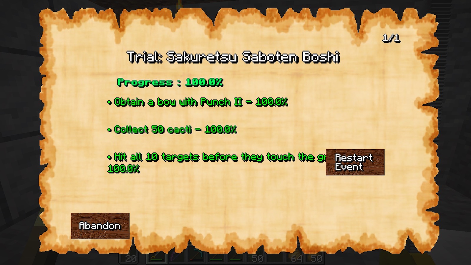必要なレベルまで上がったので、弓にパンチ2のエンチャントをつけて「炸裂サボテン星」の試練終了です。
