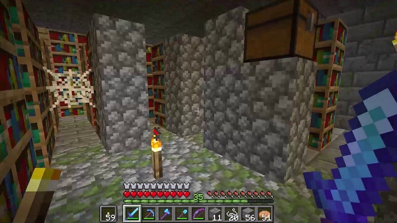 丸石と苔石が混じっているので、図書館の中にスポーン部屋が生成されたのだと思うのですが、スポナーは見当たらず。チェストは図書館のもので、スポーン部屋のチェストはなし。