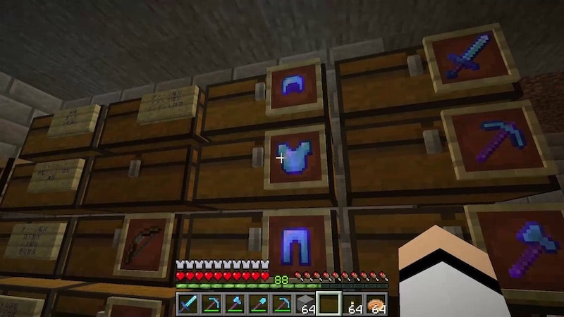 レベルが88もあるので、出かける前に予備の装備を作っておきます。ツルハシ、弓、チェストプレートにエンチャントをつけて、レベル34まで使いました。