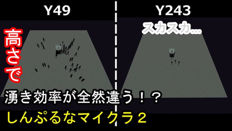 Y49とY243で湧き具合を確認してみたのですが、圧倒的にY49の方が湧きが多いんです。たまたまY243の湧きが悪いのか、高ければ高いほど湧きが悪くなるのか、あるいは一定の高さで急に湧きが悪くなるのかはよくわかりません。