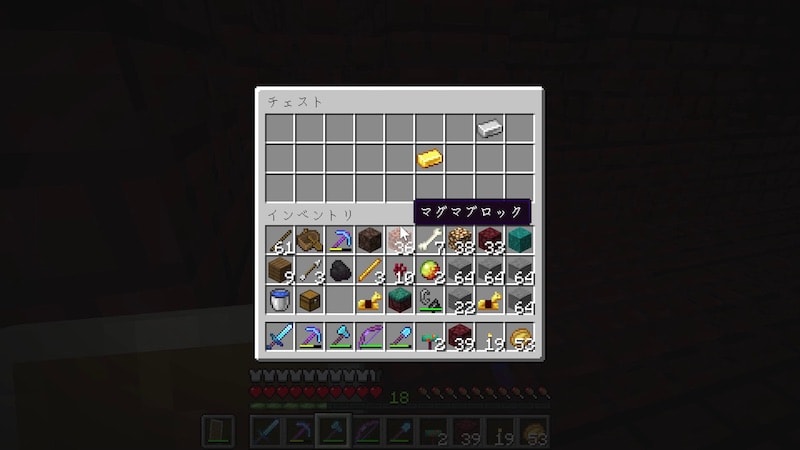ネザー金鉱石を幸運3で掘ってみると、金塊が6個でした。