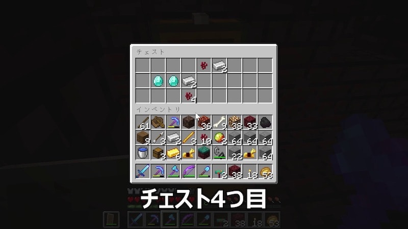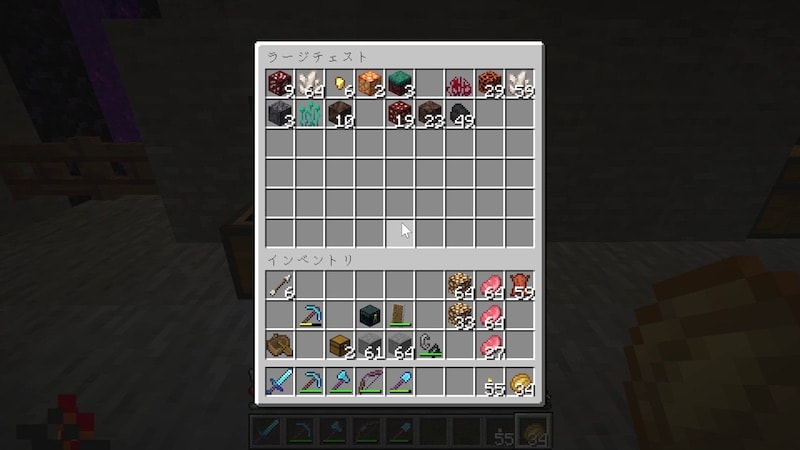 ちなみに今回ネザーに行くのは、革を手に入れるのが目的です。倉庫のチェストに額縁をつけたいのですが、友好的モブを攻撃しない縛りをしているので、ホグリンから頂くことにします。