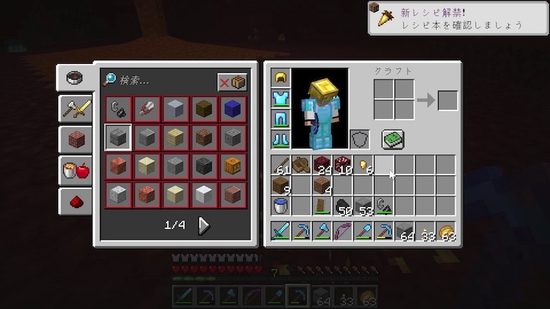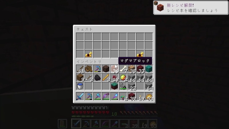 このタイミングでマグマクリームを手に入れたのですが、右上にマグマブロックが新レシピとして出てきました。マグマクリームでマグマブロックが作れることを初めて知りました。知らないことがどんどんでてきます。