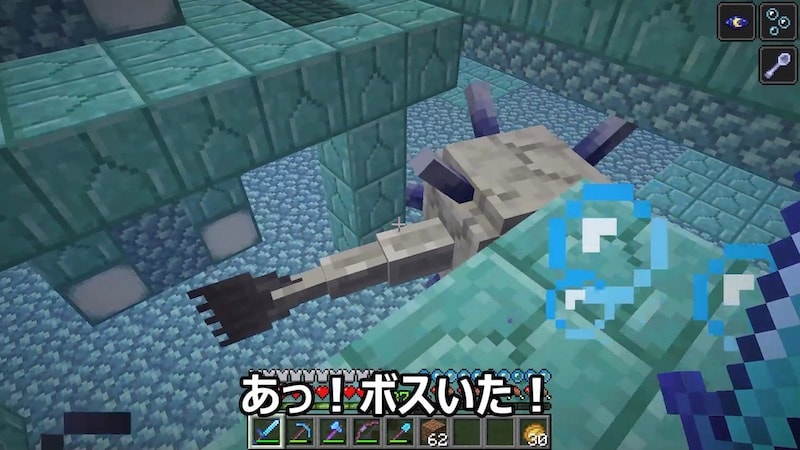 無事に海底神殿にたどり着き、潜入して10秒でエルダーガーディアンを発見してしまいました。