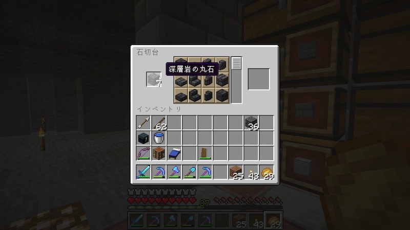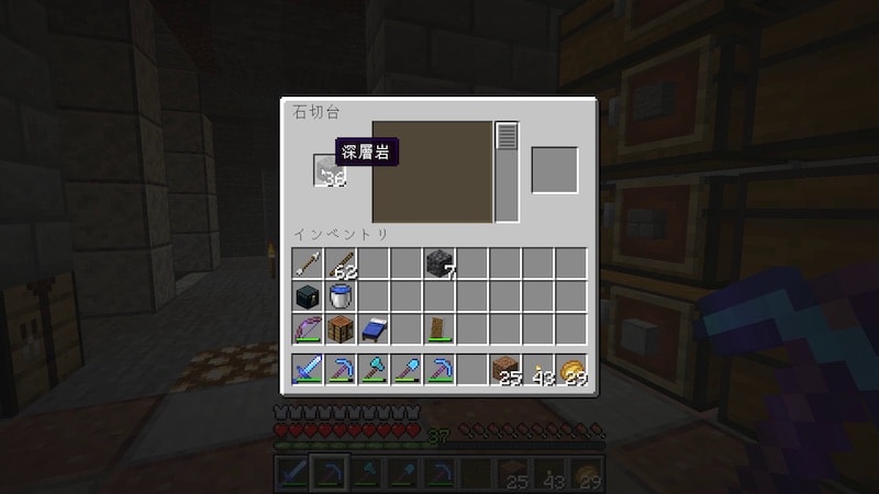 ひとつ注意が必要なのは、シルクタッチで回収したただの「深層岩」はまったく加工ができません。シルクタッチのついていないツルハシで回収して「深層岩の丸石」にしないと加工できないようです。