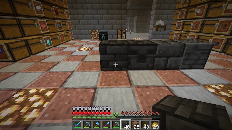 この黒いブロックは、1.17で新しく追加された深層岩の丸石を加工した深層岩タイルというものです。レンガよりも細かい切れ目が入っていてかっこいいです。グロウストーンとも色的に合います。