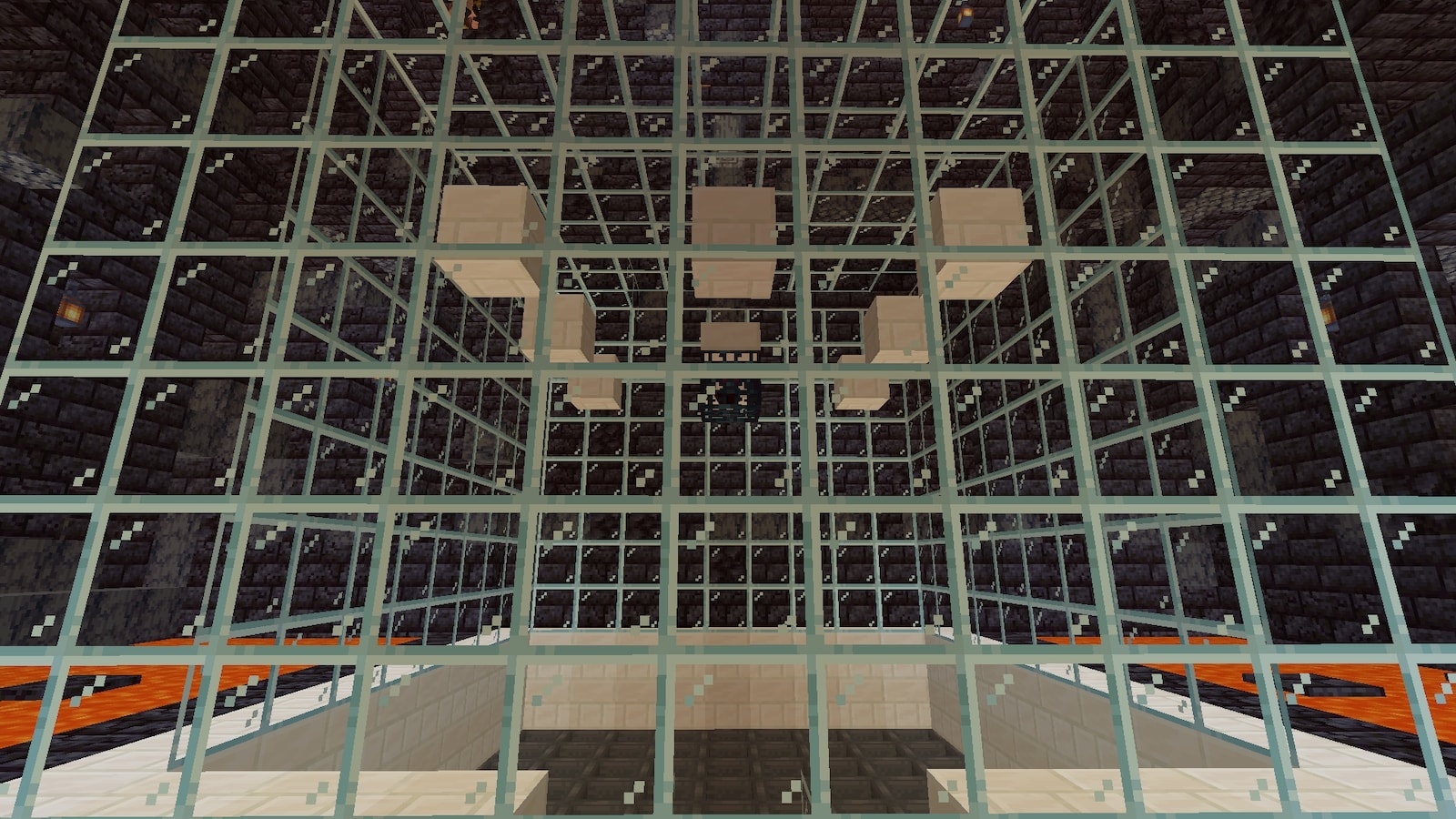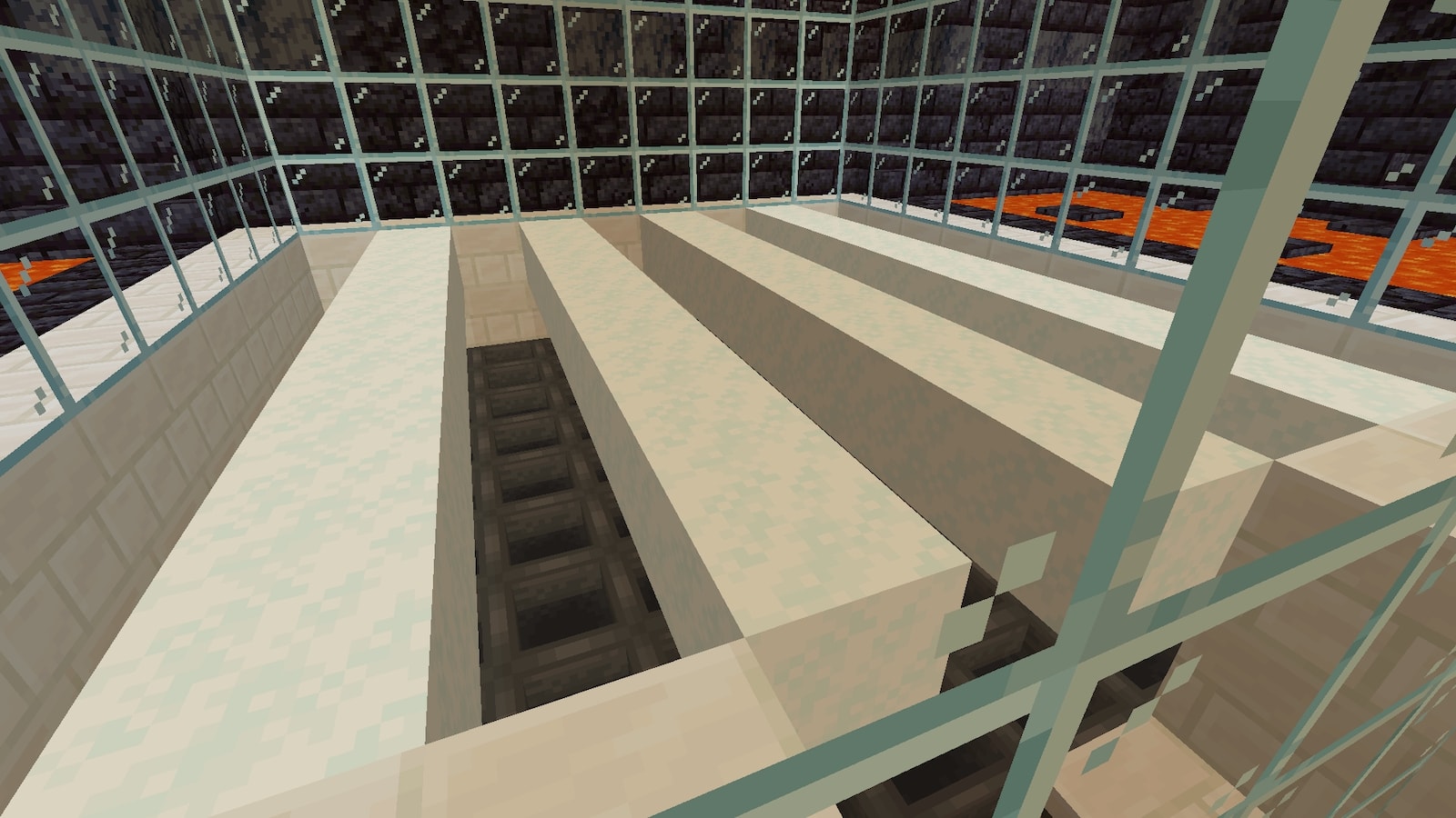 上の画像では、要塞の床の上(溶岩のひとつ上)にホッパーを敷き詰めています。こうするとスポナーとホッパーの間に3ブロックの空間ができます(スポナーの高さは要塞によって違うらしいので3ブロックになるとは限らない)。ちなみにホッパーは手前のチェストにアイテムが流れる方向に設置しています。