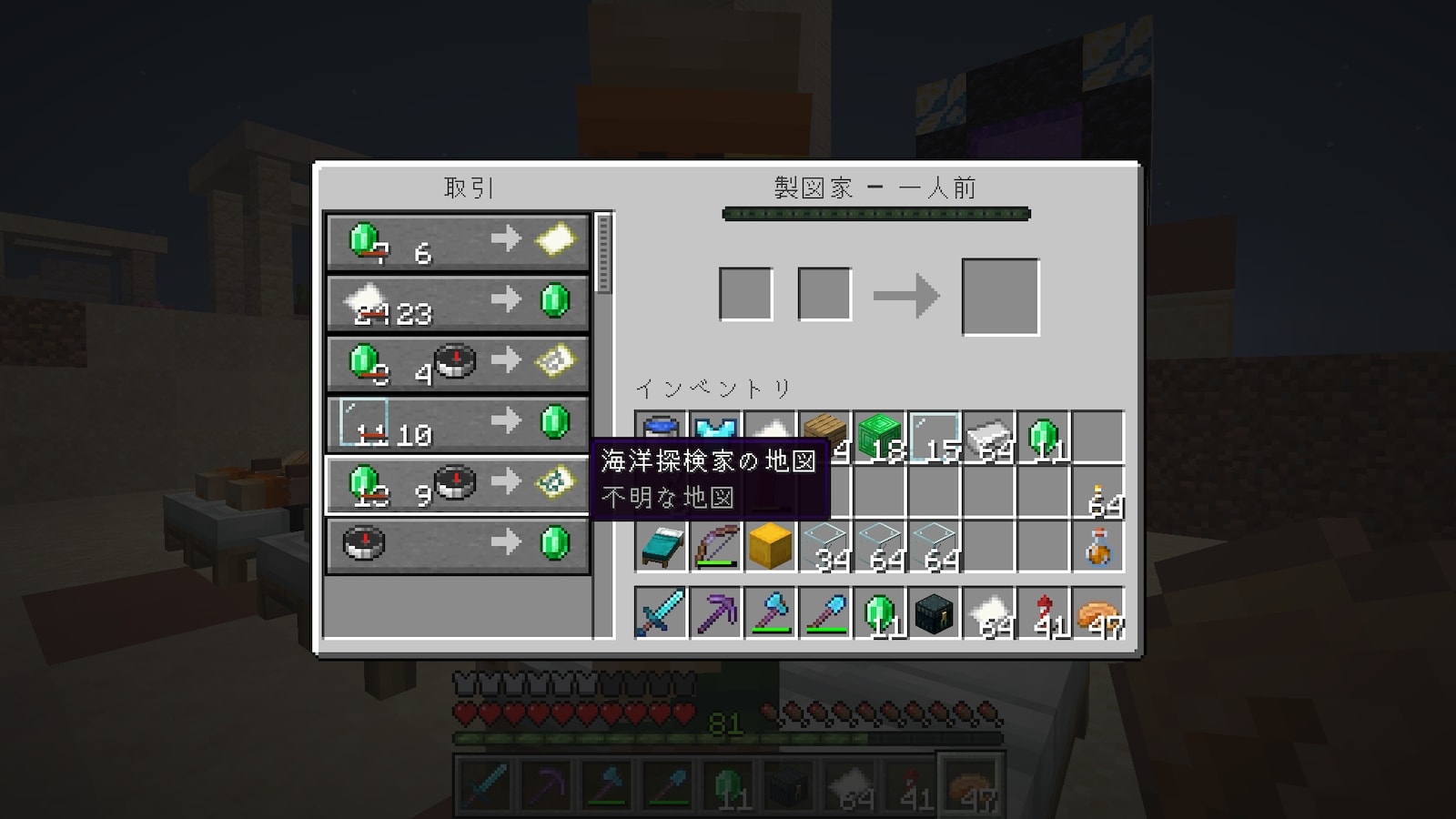 村人との交易で地図がもらえるらしいので、司書ガチャをやった村でガチャってきます。