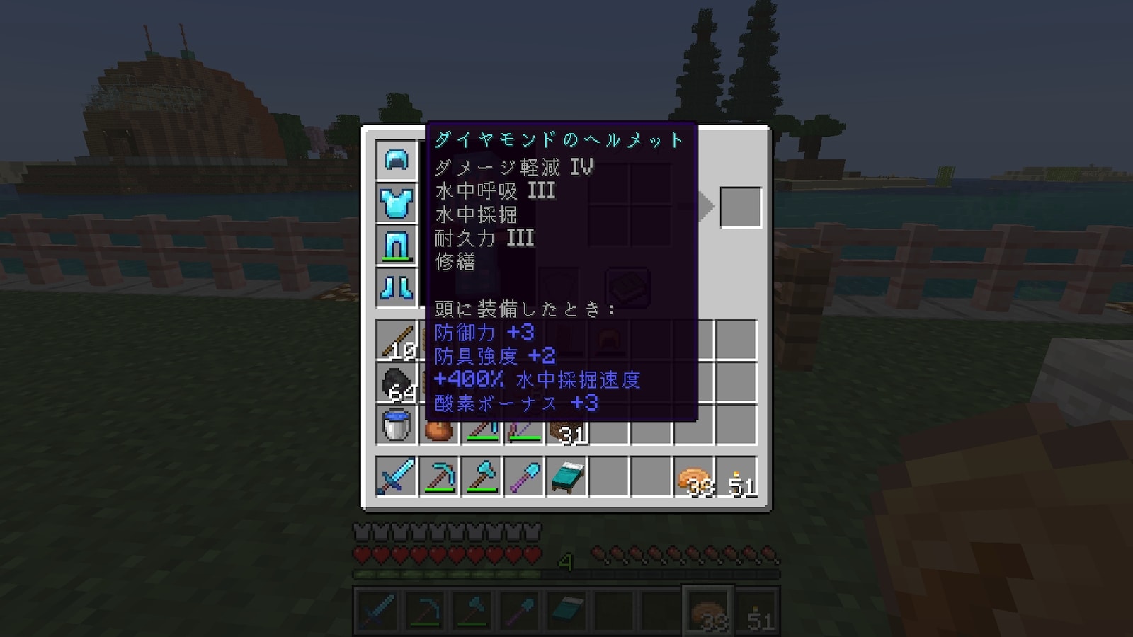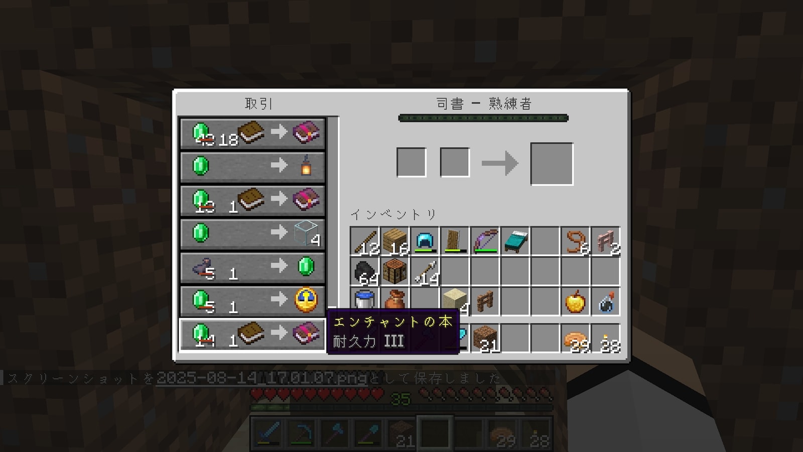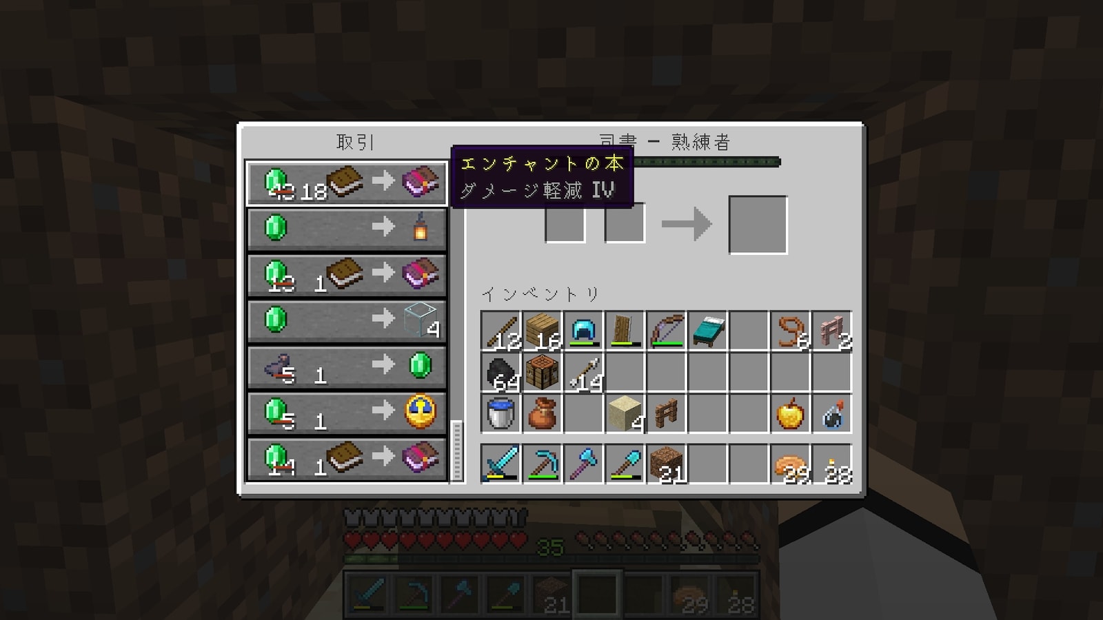 ダメージ軽減4のエンチャント本のエメラルドが、43個から18個まで減少。