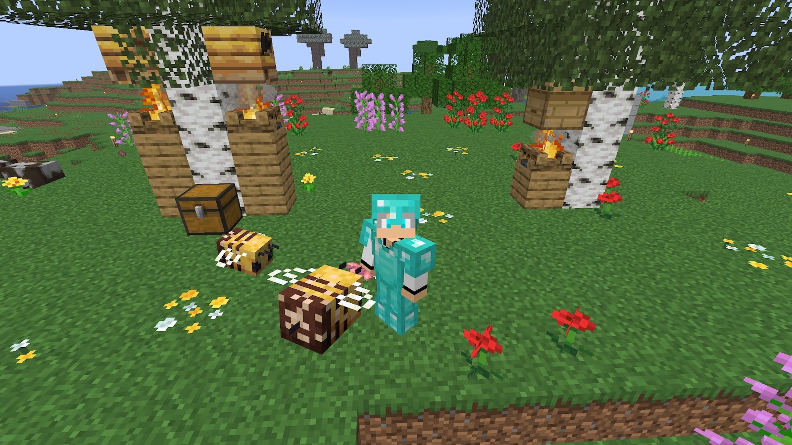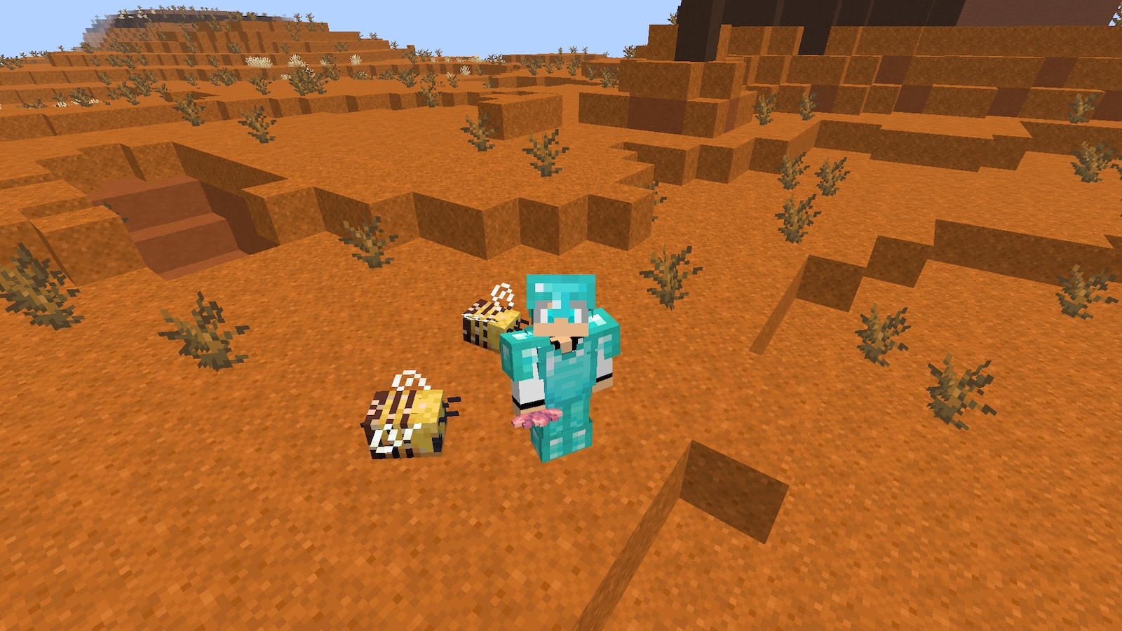 石炭と鉄を取りに行ったのに、脱走したと思われるハチを再び発見したので保護。ついでに新色ブタも連れて帰ります。