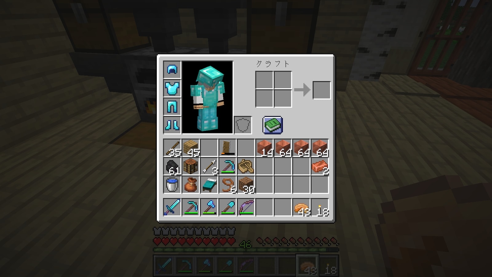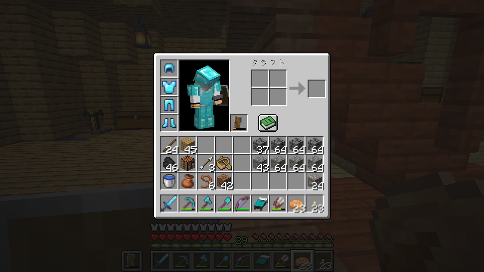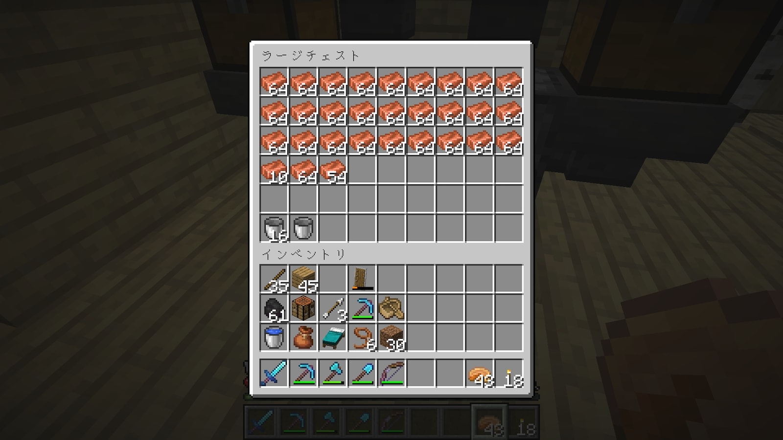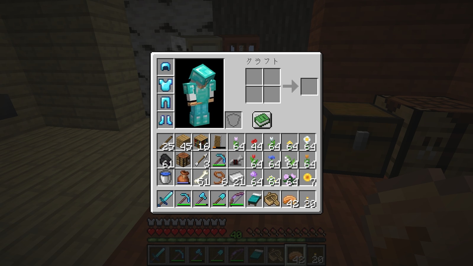 これまでは購入したエンチャント本を一箇所にまとめていましたが、今回は購入する店にチェストを置いてそこに保管することにしました。どっちが便利なんだろう。