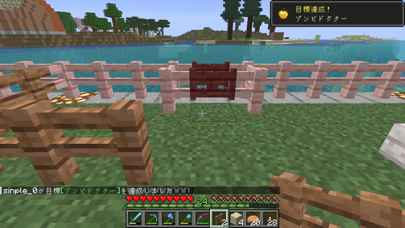 ボートをロープで引っ張れるから2人いっぺんにやっちゃえ〜、と勢いで進めましたが、よく考えたら1人が村人にもどったら、もう1人の村人ゾンビが村人を攻撃してまた村人ゾンビに戻っちゃいます。