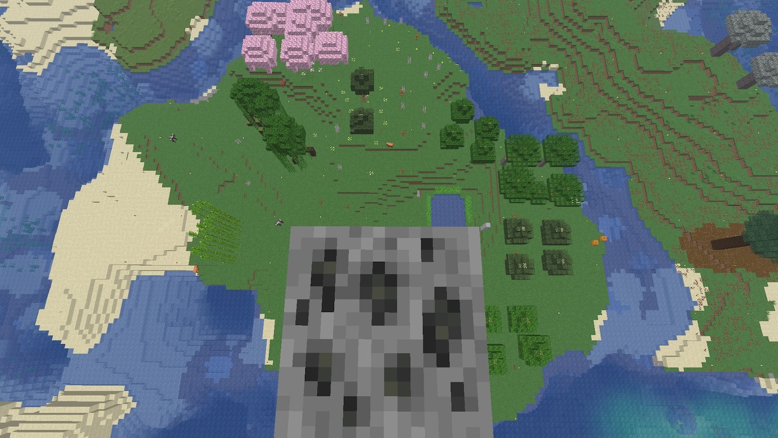 鉱石を幸運で掘るために積み上げていましたが、上から島を見ると、花が少ない感じはしますね。もっと花で埋め尽くせば、ハチたちも脱走しなくなるのでしょうか。