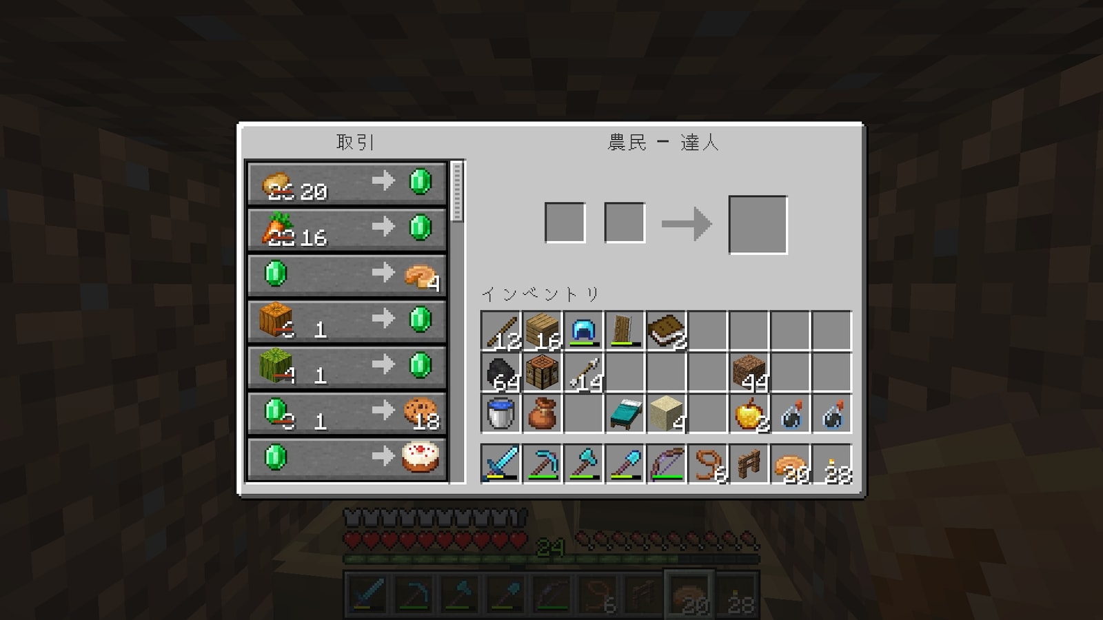 カボチャとスイカは1つでエメラルド1個と交換できるので、超高効率取引が可能。
