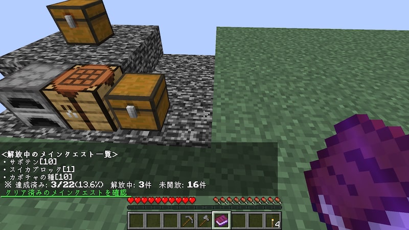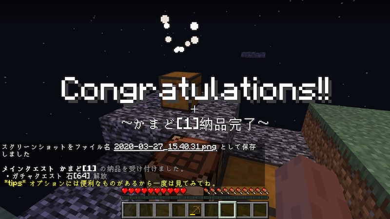 そしてかまどを納品。ガチャクエストの石64個が開放されました。何もしないでただただ掘り続ける作業は結構辛いので、時間があるときにWindowsの設定でマウスが押しっぱなしになるようにして放置になるでしょう。