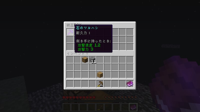 報酬は石のツルハシ耐久力1です。まだまだ序盤だからあまり良いものはもらえないですね。