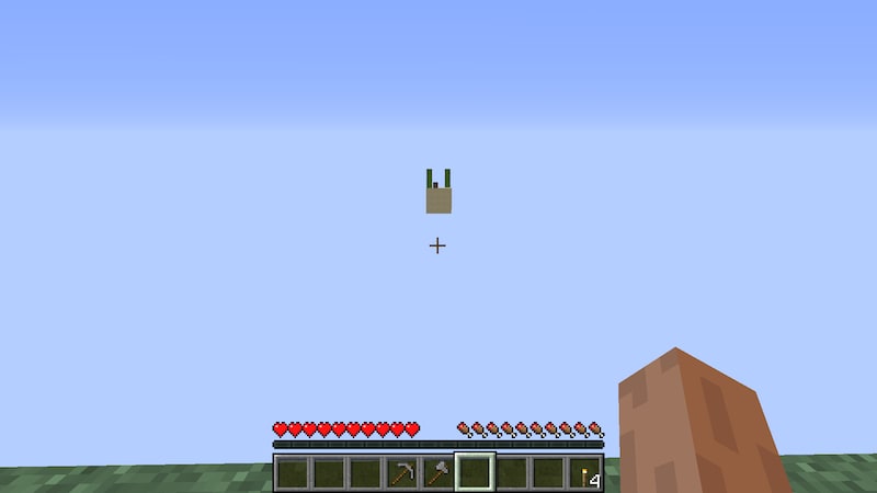 砂を回収していたら砂ごと落下して、サボテンを全ロス↓。他のアイテムは拠点のチェストに移しておきましたが、サボテンがなくなってしまったので詰みです。たぶん下から2段目の砂を壊したことによって、すべての砂が落下したようです。糸か何かで支えられているのだと思っていましたが、どうやら違ったようです。