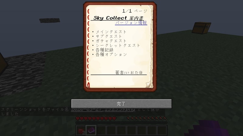 今回選んだのは「Sky Collect」という配布ワールドで、マイクラのバージョンは1.15.1です。空に浮く島で課題をクリアしていく、いわゆるスカイブロックですが、この Sky Collect は課題をクリアすると報酬がもらえるという仕様になっていて、クリアしたのかしてないのかがわかりやすいのでこれにしました。