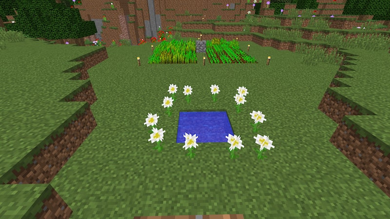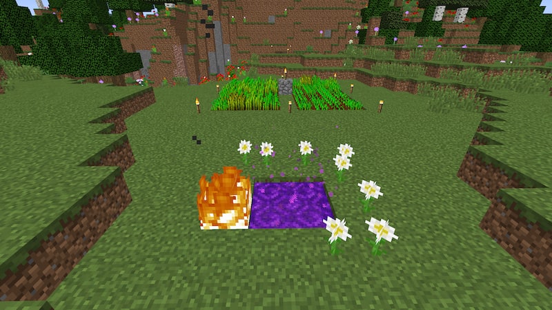 黄昏の森へのゲートは、2×2〜8×8の水源を作り、その周りを花や苗木、キノコなど自然にあるもので囲みます。そして水源にダイヤを投げ入れると…