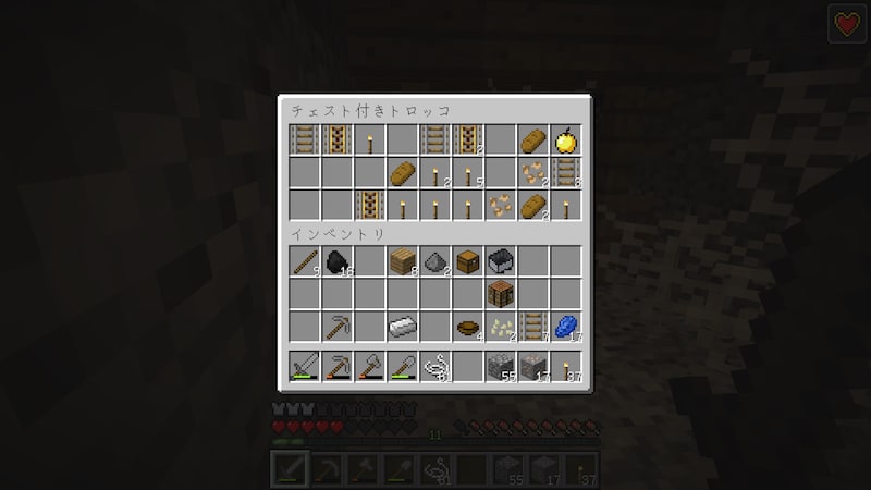 2つ目のチェストを発見。こちらもダイヤは無いです。食べ物がなくなったのでパンと金りんごは助かる。