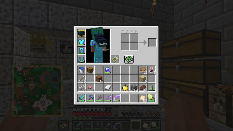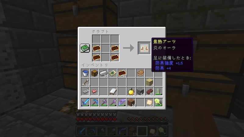 焦熱インゴットをそれぞれの防具の配置で置けばできます。かっこいいですね〜。防御力はすべてダイヤを上回りますが、耐久値はダイヤより少し低いようです。