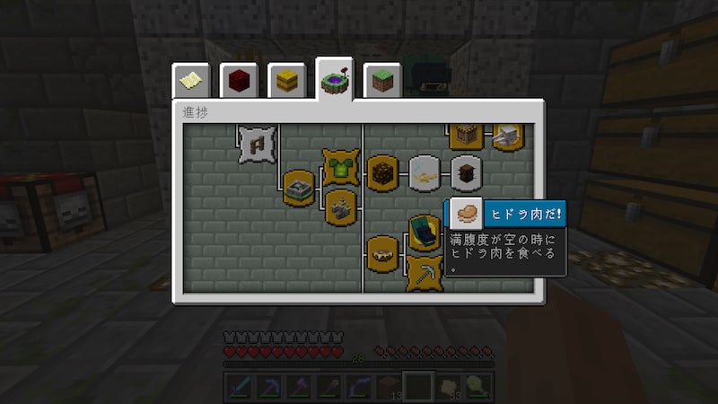 他の進捗として、「満腹度が空の時にヒドラ肉を食べる」というのがありますが、個人的にはこれが地味にキツイ。