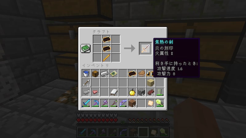 剣を作るときは、棒の部分をブレイズロッドにする必要があります。攻撃力8とダイヤ剣の7を上回りますが、こちらも耐久値がダイヤよりも少し低いようです。ただ、めちゃめちゃかっこいいです。