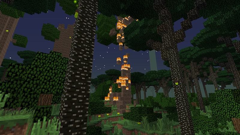 拠点から外に出てみると、なぜか木が燃えていました。雷でも落ちたかな?