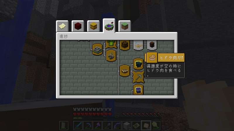 拠点に戻るには結構時間がかかるため、近くにラピスラズリがないか探していると、空腹ゲージがようやく空になりました。「満腹度が空の時にヒドラ肉を食べる」という実績を達成するために、断食をしていましたw。