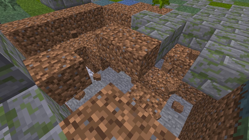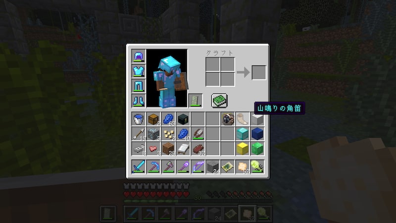 山鳴りの角笛は、使うと少し離れた位置にあるブロックを破壊したりします。土ブロックの場合は破壊されますが、焼石は丸石に、丸石は砂利に、砂利はアイテム化されます。土や一部の石系ブロックに対してしか有効ではないようなので、機能的には微妙でしょうか。すべてのブロックに有効だったとしても使い所はわかりませんが…。お遊び要素といった感じでしょうか。