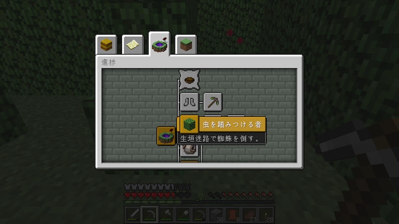 あれ?実績が解除されてない…。クモを倒さなければいけないんですね。湧く前にスポーンを壊してしまいましたw。