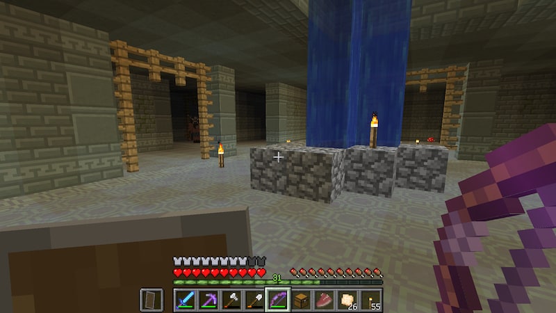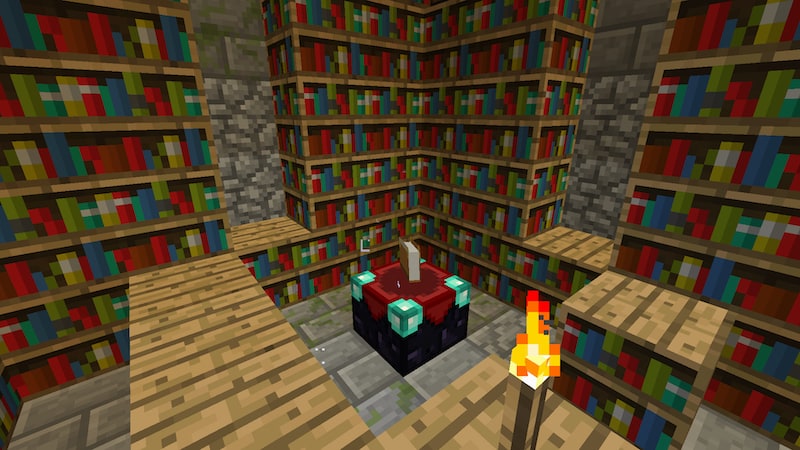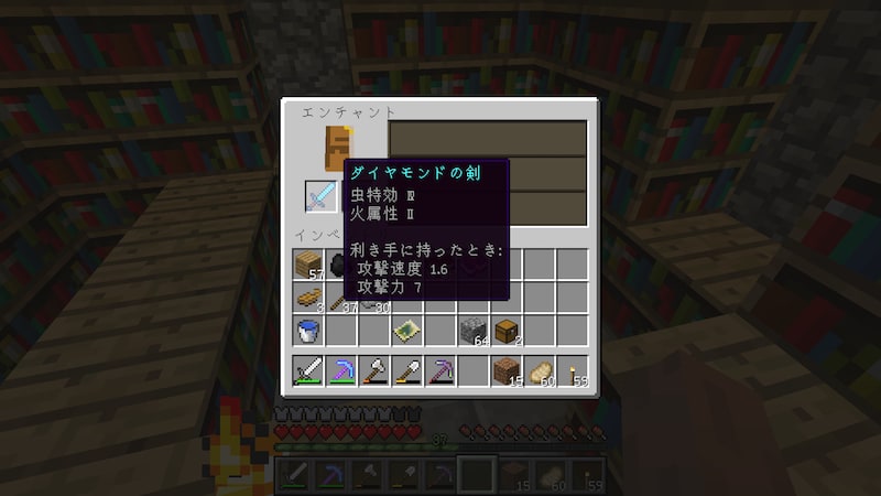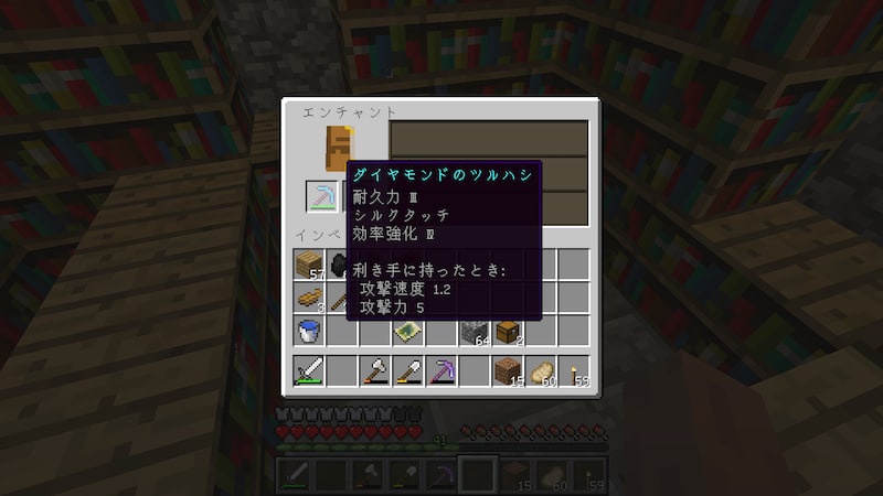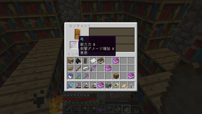 拠点の中にエンチャントルームを作ったので、エンチャントしてから行きたいと思います。ちょうど本棚がたくさんおいてある小部屋があったので、そこを活用しました。