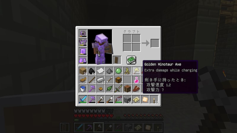 いつの間にか拾ってた、金のミノタウロスの斧。ここのボスからもらえる「ミノタウロスの斧」と同じで、ダッシュ攻撃で基礎攻撃力が2倍になるチャージアタックのエンチャントがついています。ただ、金のミノタウロスの斧は攻撃力が7しかないので微妙です。