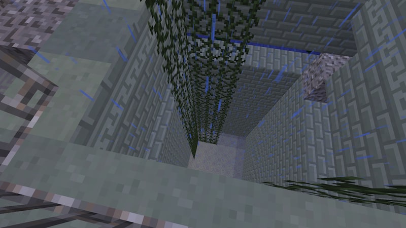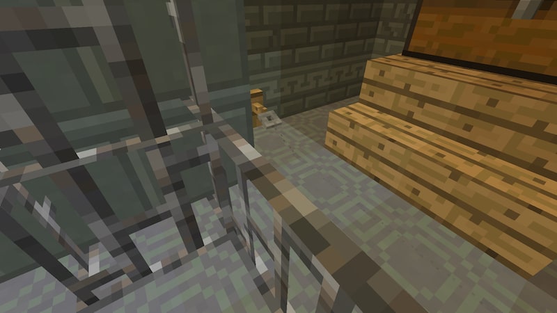 こんな感じでトリップワイヤーフックがあったりします。このとき、糸にアイテムを落下させたり糸を叩いたりすると、チェストの下にあるTNTが着火します。糸ではなく、トリップワイヤーフック本体を叩いて壊します。