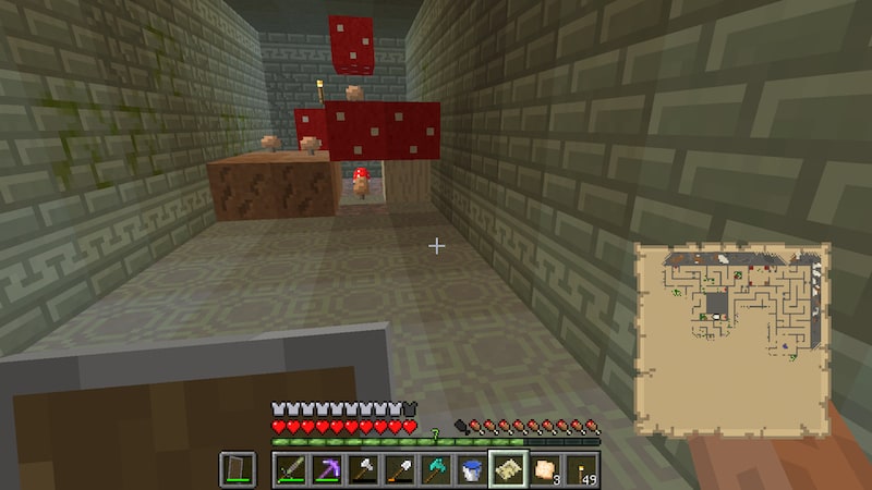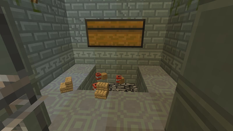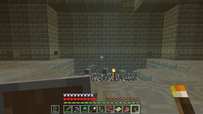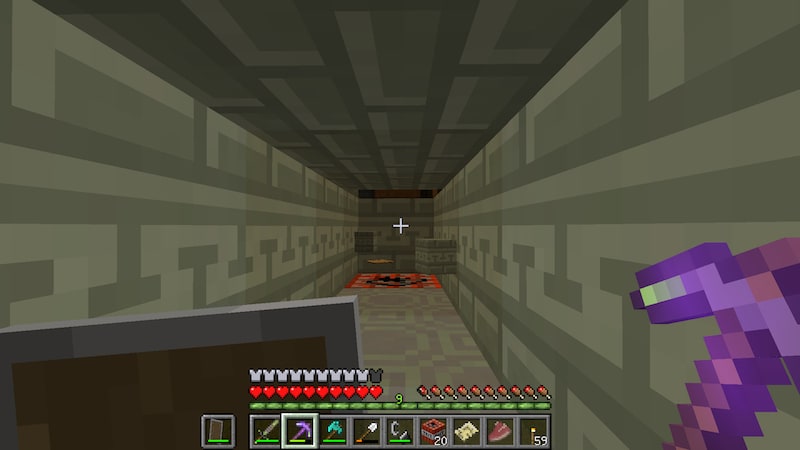 とりあえずTNTで破壊してみましたが、一マスずつしか壊れないのでツルハシで掘ることに。納骨堂にはTNTが仕掛けられているので、手で掘るほうが安全です。時間はかかりますが…。