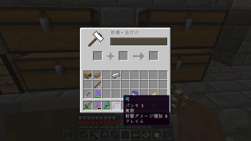 弓を紛失してしまったので、納骨堂で手に入れた弓を金床で合体させました。耐久力がついていませんが仕方ない。