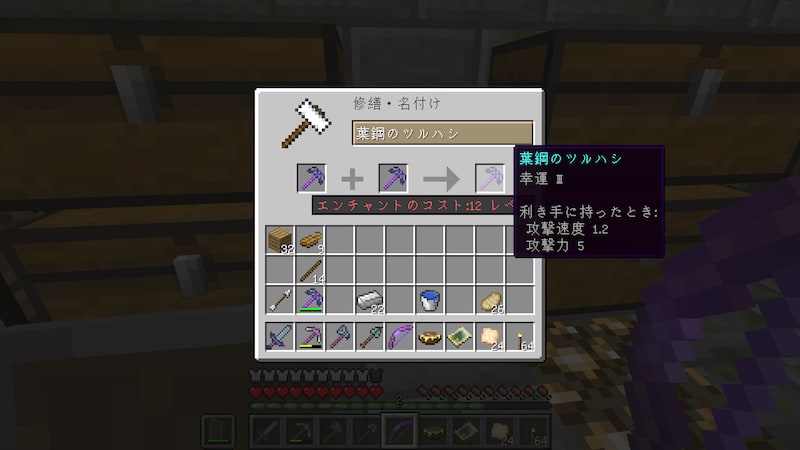 葉鋼のツルハシ2つを合体させて、幸運3にします。しかし、レベルが足りませんでしたw。