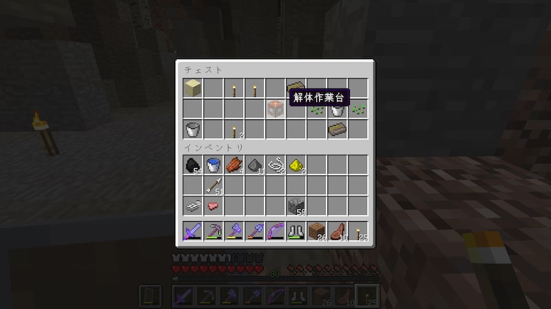 チェストの中身を見てなかったので見て回っていると、解体作業台を発見。魔法の金貨があればクラフトできたと思いますが、すっかり忘れていました。