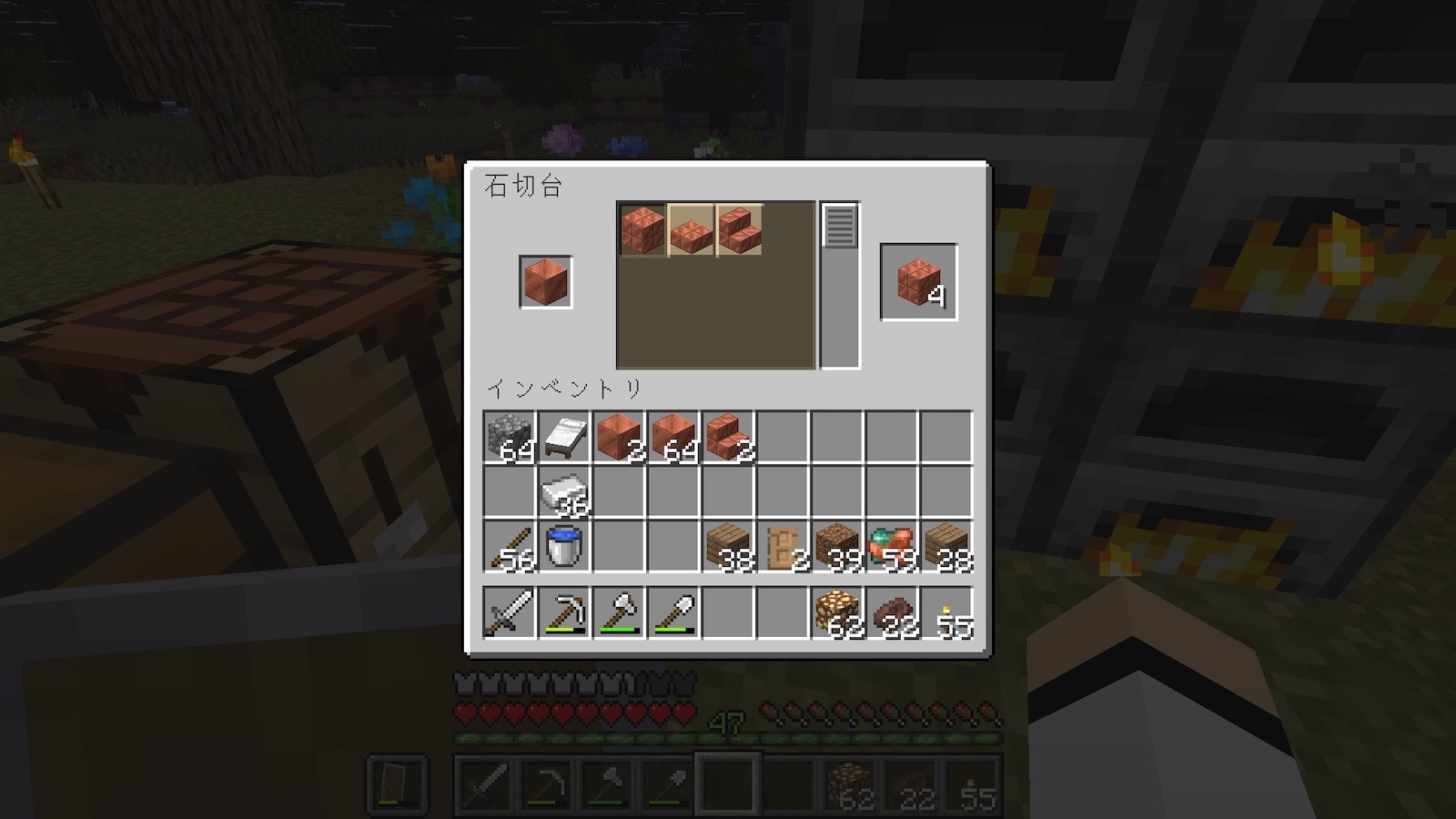 銅って石切台で切れるんですね。たぶん初めて知りました。しかも銅ブロック1個から切り込み入りの銅が4つもできる。