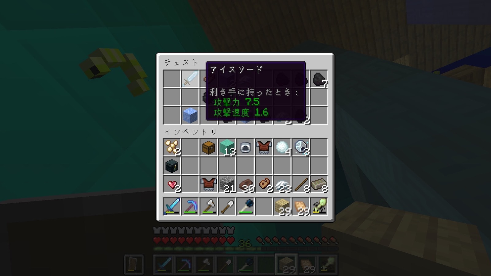 チート武器第2段。いや、耐久値が低いからまだ許せるレベルかも。ただし、これに修繕がつくとぶっ壊れ性能です。攻撃力がダイヤソードより強い上に、移動速度低下を付与します。