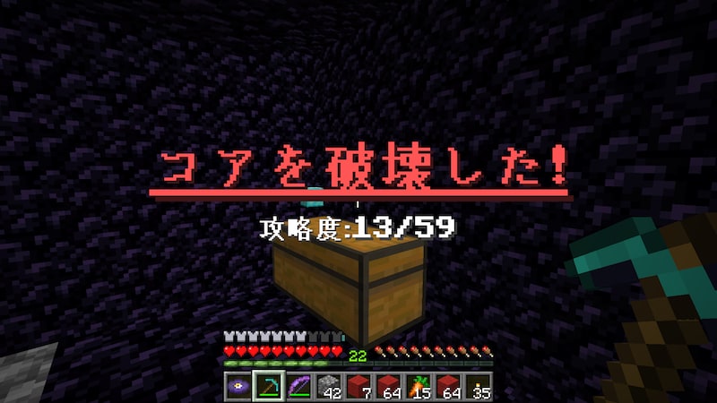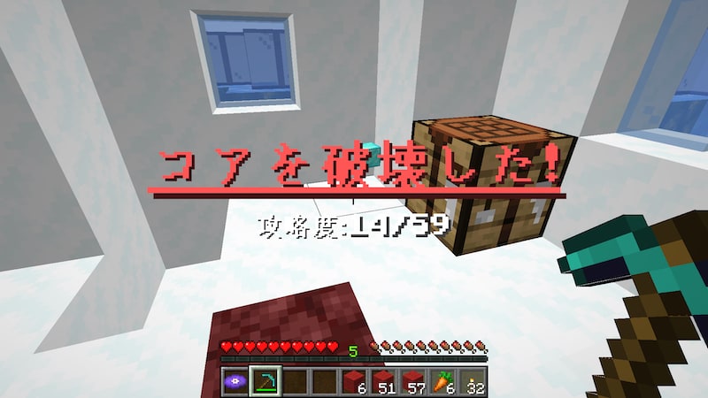 14個目のコアを破壊。今更ですが、コアを壊すとダイヤブロックが手に入ります。最初の頃はこれを知らなくて、石や金のツルハシで壊していたのでもったいなかった。