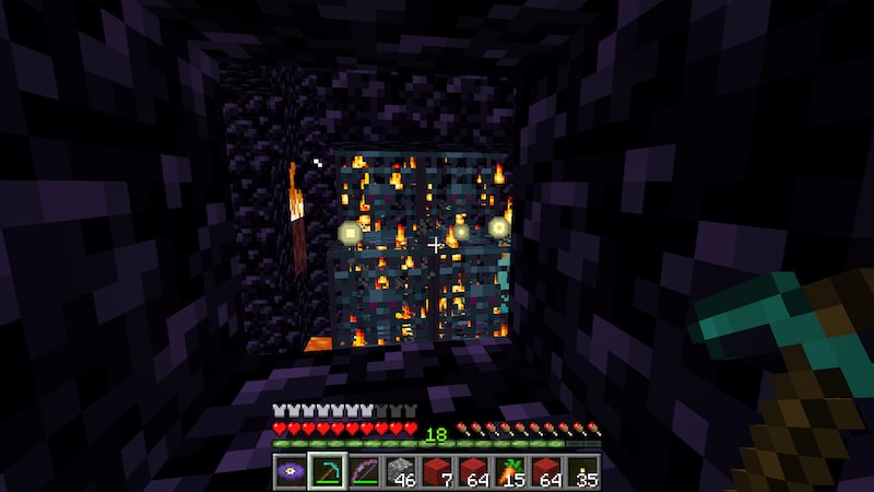 外から見えるスポナーは壊しましたが、中からエンダーマンの声が聞こえるので黒曜石を破壊して見ると、中にどっさりとスポナーが…。目を合わせなければ攻撃してこないようなので、スポナーを壊すのは簡単です。ただ、周りの溶岩の後始末が面倒くさい。