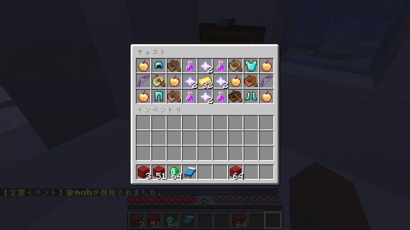 チェストの中身です。ダイヤ防具、弓、金りんごはありがたいです。